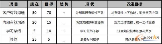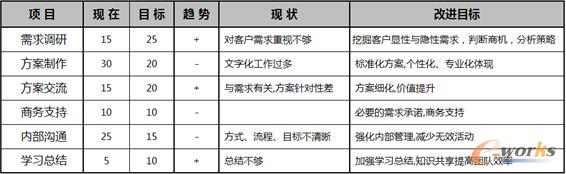 售前顧問有效時間分布與利用是否合理,關系到項目的成敗。下面兩張圖,分別從項目環節與溝通時間的現狀與改進目標進行闡述。