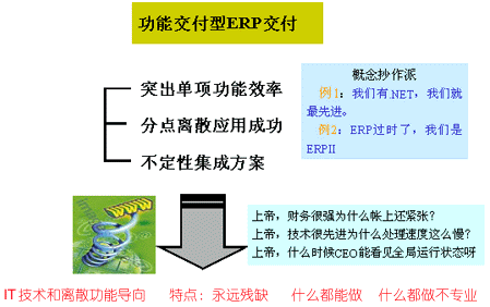 第二種ERP叫功能交付型:這種ERP交付突出單項功能,用離散的應用來闡述其功能,表述其系統,而系統的集成性和應用模式又極不確定,這種廠商往往淪落成一種概念炒作。這兩天我上網看,概念特別多,比如有人說我有了.NET就是最好的ERP,昨天有人問我這個問題,我說難道我開著奔馳就是富翁,也許我家里沒有存款,可能這個車也是借來的。還有人說ERP過時了,說ERPII是最好的,即使說ERPII是最好的,可你是真的ERPII嗎?還有人用速度衡量,但事實上ERP是一個綜合的。在這種情況下,客戶會遇到什么問題呢?一上單項真的很強,比如一上財務這一塊確實很強,但為什么其他的地方還不行?當然,因為光強調一點不行,光財務好,銷售這一塊不行,也上不去。還有人說我用的技術很先進,為什么速度還上不來,殊不知描述速度是用單位速度描述。還有人說CEO什么時候能看見全局運行呀?因為今天上一點,明天上一點,數據是殘缺的,沒有辦法看成。第二種交付方式的特點是永遠殘缺,好象什么都能做,什么都做不專業。所以這造成了中國始終對ERP懷疑的聲音高于信任的聲音,雖然這個市場非常大。