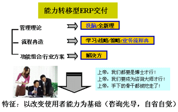 作為第一次為中國軟件企業奪回第一品牌的企業我們在考慮如何改變這個現象。我們看到第一種能力轉移型對中國企業有一定的幫助,但風險非常高。他的口頭禪是我幫你努力好,師傅領進門,努力靠個人,不成功是你笨。很多用戶很自責,說用不好ERP,他們的軟件沒問題。還有一種是夸大IT的作用,忽視整體的作用。你要注意這種人不是下棋的,是做棋盤的,他研究的不是下棋,而是棋盤怎么做得漂亮,你這是拜錯師,這兩種ERP充斥市場,中國中小企業面臨的情景可以想見。