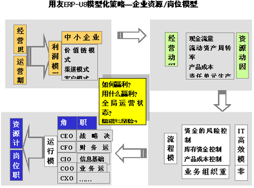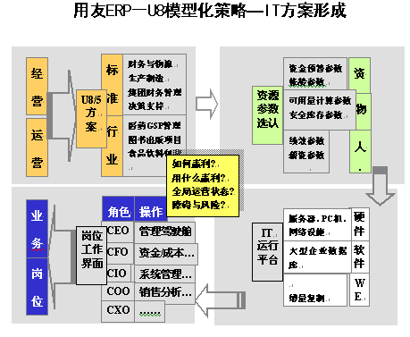 拿著這個模板,走到用友ERP—U8方案的時候會找到軟件插件配比層支持其模型的IT方案。進而再根據上一頁資源庫中提到的資源動因決定企業參數。再根據IT的基本部署要求,硬件、軟件、網絡等部署要求進一步把流程和這種動因整合好,變成每一個崗位角色的具體操作。比如CEO經常操作管理駕駛倉,CFO看的是管理成本,COO對運營交互關系比較重視。我們把這些變成具體的操作,這個時候用戶看到U8進入模式的時候,看到的第一個不是軟件功能,而是與其利潤配比的方案,再往下走看到的還不是軟件的功能,而是看到企業的動因在軟件中是怎么監控的。再往下走看到的還不是功能,而不是每個人的職責,根據職責設定出個人的工作界面工作流程,最后能反映出它的工作狀態和操作任務。