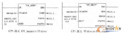 在STEP7用戶程序中,兩個專用的FC塊可用于數據交換:DP-SEND:將CPU中的指定的DP數據區(qū)的數據發(fā)送到Profibus-CP的緩沖器,以便傳送給DP從站。DP-RECV:從DP從站中讀取數據,將Profibus-CP接收緩沖區(qū)的數據放入CPU指定的DP數據區(qū)中。