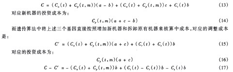 如果殘值按照購買單價的30%計算,則C—Cˊ<70%Cp(t,m)<0,即通過遺傳算法得到的適應度函數值偏高。同時可以看出,遺傳算法得到的投資成本也偏高.解決這個問題的一個方法是,在評價一個染色體的適應度時,首先識別略集中t和m相同的元素,并同時識別是否存在機器轉移的情況,如果存在,則需要根據(13)式計算生產能力調整成本以修正該染色體的總成本,并同時修正適應度函數值。