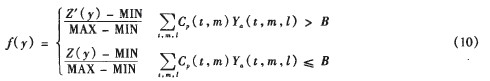 在(10)式中,Zˊ(y)是模型M1的目標函數值上增加超過投資預算的適應性懲罰因子P(g,y)后的總成本,g為遺傳算法進化的代數,即