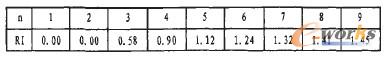 其中Rl是在判斷矩陣中隨機輸入1~9及其倒數(shù)時計算得到的CI的平均值,對1~9階矩陣其Rl值見表3。在此基礎上采用隨機一致性比率CR作為檢驗判斷矩陣一次性指標。