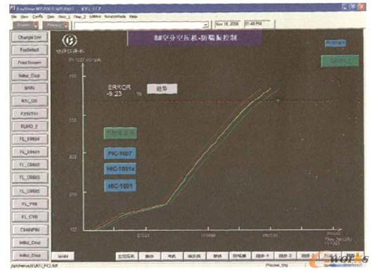 此外,在DCS監(jiān)控面面上實現(xiàn)了壓縮機組運行點的動態(tài)指示,如圖2所示。使操作人員對機組運行位置以及與控制線、喘振線的距離都能一目了然,便于操作人員必要時盡可能快地干預(yù)設(shè)備運行狀態(tài),減少了故障的發(fā)生。