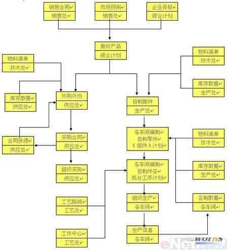 下面通過一個典型的例子來說明實施ERP系統會給企業帶來的顯著變化。某制造企業,其產品非常龐大且結構復雜,所需的零部件和原材料多達上萬種,包括金屬零部件、木質零部件、電子零部件等。由于所生產的產品品種多、變型多,因此每月編制物料需求計劃工作量極大。在以手工方式編制物料需求計劃這件工作不是由幾個生產計劃人員所能完成的,于是,企業只能把這項工作分開來由幾個部門來作,參與編制物料需求計劃的部門有生產管理部門、采購部門、甚至幾個較大的車間也參與到這項工作中來。參加這項工作的人員多達四十多人,造成了人力上的極大浪費。此外,同一個計劃由幾個部門分頭去做,有時由于所依據的資料(如物料清單、材料消耗定額、零部件原材料的庫存數據、車間在制品數據等)不統一,比如所使用的數據在時間上不一致、更新程度不一致等,造成計算結果有很大差異。該廠在引進ERP前編制物料需求計劃的業務流程如圖2所示。