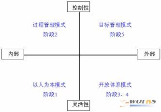 從縱坐標看,越往下走越來越強調靈活程度,體現(xiàn)了管理的柔性;越往上走控制力度越大,體現(xiàn)了管理的剛性。從橫坐標看,越往右走就越強調管理的開放程度,往左走更偏重于內部管理。成長性企業(yè)發(fā)展第一階段的管理模式,可以稱之為以人為本,僅透過創(chuàng)業(yè)者本人就可驅動企業(yè)的發(fā)展,體現(xiàn)了最大程度的人性化和自由度;第二個階段的重心是過程管理,需要有一個規(guī)范化的管理體系和業(yè)務流程;第三和第四階段,由于管理彈性增加、強調合作與開放,處在這兩個階段的管理模式可以統(tǒng)稱為開放體系模式;第五個階段,更是目前絕大多數中國企業(yè)遠未達到的境界,就是以目標為導向的管理模式,簡稱目標管理。