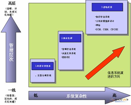 從上圖我們可以看到,信息系統(tǒng)隨著復雜程度越來越高,它為企業(yè)管理的層次,特別是為高層管理提供的服務就更有價值。在信息系統(tǒng)復雜程度較低的時候,它一般處理一些事務性交易,目的是提高企業(yè)的工作效率,這是成長性企業(yè)在第一、二階段特別需要解決的問題。企業(yè)發(fā)展到第三、第四階段,需要把信息系統(tǒng)當作一種商業(yè)資源,尤其需要管理信息系統(tǒng)方面的東西,如ERP、CRM、EIS等,因為企業(yè)跨越第二個發(fā)展鴻溝后,客戶會越來越多,面對一個更為龐大的主流市場,需要運用客戶關系管理的手段,并創(chuàng)造業(yè)務差異化的最大優(yōu)勢。當企業(yè)發(fā)展到第四或者更高階段之后,就需要一套戰(zhàn)略管理系統(tǒng),這時的信息系統(tǒng)應該變成一種戰(zhàn)略武器。所以信息系統(tǒng)隨著復雜性地不斷衍進,能夠幫助成長性企業(yè)不斷創(chuàng)造出變革的優(yōu)勢。