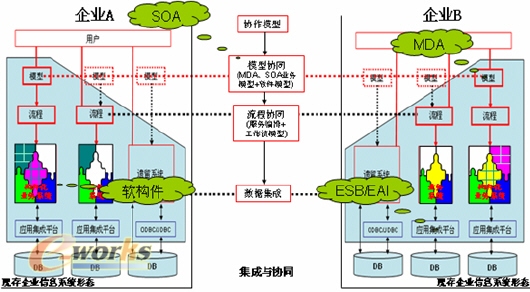 支持企業間協同的互操作技術關鍵在于三點,包括提供互操作體系架構和平臺,定義企業的建模方法,還有表述的企業知識。這是歐洲人提出來的思路,比如兩個系統,他們要實現集成,可以直接通過軟件工程集成,也可以向上一層,面向IT模型的集成。再向上一層,可以實現管理者之間的集成,但是這里面有很多大量的術語和理解的不同,這需要有本體論來支持。不僅僅是數據協同,流程的協同,最后要達到企業群的協作,這里面就要包含SOA的方法。