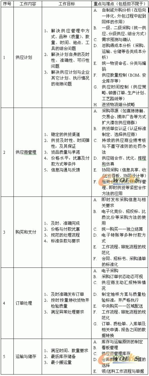 表一:供應(yīng)管理的工作目標(biāo)、工作重點(diǎn)與難點(diǎn)