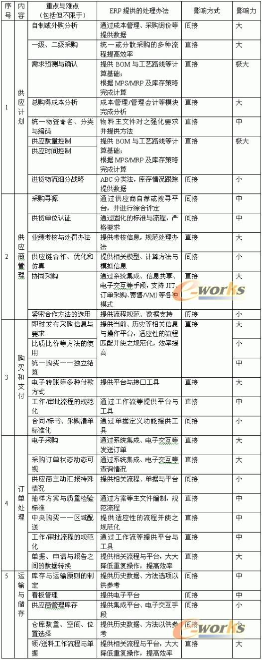 綜合上述系統(tǒng)的功能與方法,可以看出ERP能夠?yàn)楣⿷?yīng)管理帶來(lái)的方法上的幫助與改善,以及這些方法對(duì)供應(yīng)管理、供應(yīng)績(jī)效的影響方式與影響力,如表二。