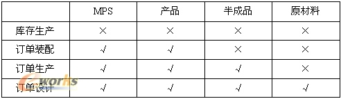 為了實現上述四種生產方式的跟蹤,可以將項目層次分為MPS、產品、半成品及原材料,假若有一個訂單Order,為了實現上述四種生產類型,需要控制不同層次主體是否帶入對應的訂單號,如下表所示: