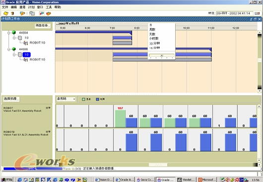 Oracle制造排產能讓您的業務處于最有活力的狀態,它以圖表拖拉功能來重新排產,使您能很快地找到最佳方案。運用這種根據計劃強制實現的技術,以及非常直觀的圖形界面,您能很快地重新安排積壓的作業,并能提高工作效率。如下圖所示: