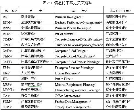 企業信息化是一項革命性工程,其主要內容涵蓋企業運作的各個方面,涉及到各種各樣的概念,在談信息化的文章中更是常常出現各種英文縮寫,如表2-1所示。