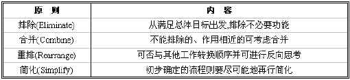 以ERP方案設計中業務流程圖的設計為例。目前流行的確定業務流程的有四項原則:排除,合并,重排,簡化。如表1所示。