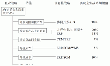 這里僅僅舉了一個增加銷售利潤率的戰略目標,如果企業的經營戰略有多個目標,就要分清輕重緩急,排列各個目標的優先級。確定優先級又有各種決策原則,例如以為企業帶來效益的大小為準,或以投資大小、實施的難易程度等為準。然后逐個分析各個目標需要什么信息技術的支持,再進一步制訂信息化戰略。