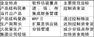 一個完善的ERP系統是一個十分龐大的系統。企業選擇管理軟件不必追究是不是真正的ERP軟件,選軟件也不是按大企業、小企業來區分,我認為要根據產品特點、生產組織方式、經營管理方式的不同來選擇適用的軟件,見表1。