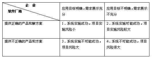 上表中不僅僅說企業(yè)“需求明確”,而且使用了“企業(yè)充分展示需求”的說法,二者的區(qū)別是前者僅僅是企業(yè)單方面的需求明確,后者是企業(yè)不僅有明確的需求,還包括企業(yè)為軟件廠商提供了相應(yīng)的條件,讓軟件廠商獲得了明確的需求,我們可以看到這之間是決定性的差別存在的,二者的差距是導(dǎo)致現(xiàn)實(shí)中ERP項(xiàng)目難以成功的一個(gè)大障礙(后面闡述)。上面四種情況含義: