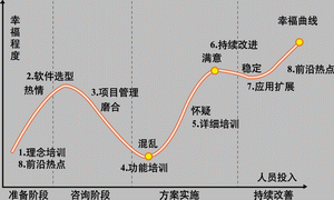 ERP實施的過程中,無論是企業還是企業中的個體,從中高層管理者到項目小組、關鍵用戶,基本上都要經歷一個心理起伏的歷程,我們形象地稱之為“幸福曲線”。曲線橫軸是項目人員所投入的項目階段,縱軸是項目人員的幸福程度。整個歷程可以劃分為熱情、磨合、混亂、懷凝、滿意、穩定和持繼改進等多個階段。從中可見,在整個變革過程中,從不知情的盲目樂觀到知情后的悲觀,最后過渡到知情后的努力工作,直到對實施效果的滿意,這的確需要一個漫長的過程。與之相匹配,“培訓”在當中扮演著啟動一個階段,并帶領人們走出這個階段、走向下一個階段的角色。培訓對象通過ERP培訓進行學習,其實也是一項艱苦的工作。比如說,詳細的功能模塊培訓,不可能完全像理念培訓中看漫畫的環節那樣有趣,現在需要倉庫管理的人員來清楚掌握ERP軟件庫存模塊當中“庫存組織的多層次結構”、“物料屬性的維護”、“批號與序列號的跟蹤控制”、“雜項接收與發料”、“循環盤點的實現”等一大堆相對抽象的概念,這是非得打起精神、拿出一點兒學習的勁頭不可的。