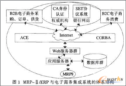 圖1中概括了MRP/ERP與電子商務集成系統的各主要企業生產和商務邏輯處理部件:MRP/ERP系統、電子商務系統、安全認證系統等。
