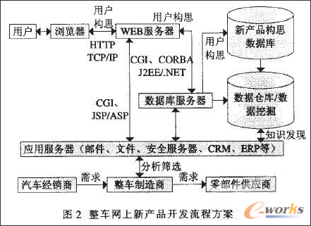 汽車整車制造企業可在自己的網站建立“新產品構思”的交互性欄目。企業利用J2EE或.NET技術再加上oracle SQLserver數據庫便可輕松地 建立該欄目。“新產品構思”包括登錄客戶的姓名、電話、地址、新產品構思細節以及新產品構思效果圖等內容。當用戶將自己的構思內容填 人網頁表單中的相應空白處后,可單擊頁面中的提交按鈕便可將用戶所填寫內容通過互聯網傳遞到企業的后臺“新產品構思”數據庫中。利用 “新產品構思”數據庫和系統數據庫可以產生數據倉庫,利用數據倉庫進行OLAP(聯機分析)和數據挖掘,進行智能化的決策。