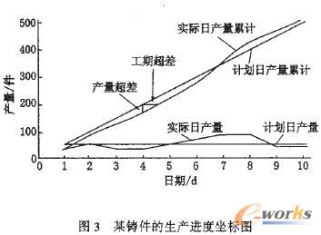 鑄造企業(yè)的產(chǎn)品規(guī)格較為穩(wěn)定,工序?qū)iT化程度高,產(chǎn)量隨時(shí)間變化。因此,本系統(tǒng)采用坐標(biāo)圖閉來描述實(shí)際生產(chǎn)數(shù)和計(jì)劃產(chǎn)量數(shù)的進(jìn)度,比較實(shí)際生產(chǎn)進(jìn)度與計(jì)劃進(jìn)度的差異,程序自動(dòng)生成各生產(chǎn)時(shí)段的計(jì)劃實(shí)際對(duì)照表(如表),然后根據(jù)此表繪出生產(chǎn)進(jìn)度坐標(biāo)圖(如圖3),通過人機(jī)交互控制生產(chǎn)作業(yè)的進(jìn)程。