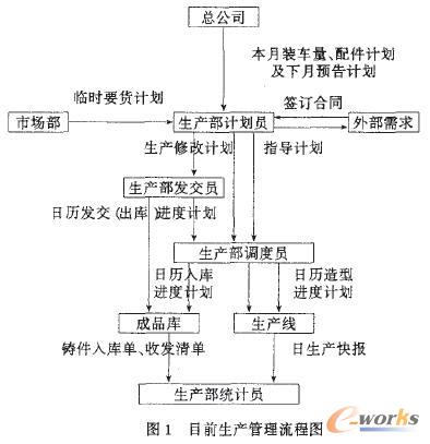 工廠目前的生產(chǎn)管理狀況如圖1所示。通過調(diào)研分析發(fā)現(xiàn),鑄造一廠有較好的管理基礎(chǔ),其管理水平在東風(fēng)汽車公司中一直處于先進(jìn)的行列,該廠已通IS09002和QS9000認(rèn)證。但是,由于生產(chǎn)管理的自動(dòng)化程度較低,生產(chǎn)管理中還存在如下的不足: