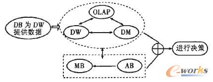 (1)DW:實現對決策主題數據的存儲和綜合,為DSS提供數據存儲和組織的集成。對底層數據庫中的數據進行集成、轉換、綜合,組織成面向全局的數據視圖。