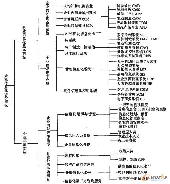 企業(yè)網(wǎng)絡(luò)信息化是信息化的成熟期。在這一階段企業(yè)利用網(wǎng)絡(luò)實(shí)現(xiàn)信息技術(shù)、信息資源、信息管理的整合集成。主要以人均計(jì)算機(jī)擁有量CAD/CAE/CAPP/CAM、NC/FMC/CAT、OA、財(cái)務(wù)管理系統(tǒng)等單項(xiàng)系統(tǒng)應(yīng)用指標(biāo)來(lái)評(píng)估。在這一層次中企業(yè)初步制定信息化發(fā)展戰(zhàn)略、規(guī)劃、制度,但是還沒有專門的信息化部門,企業(yè)員工信息化素質(zhì)普遍不高。