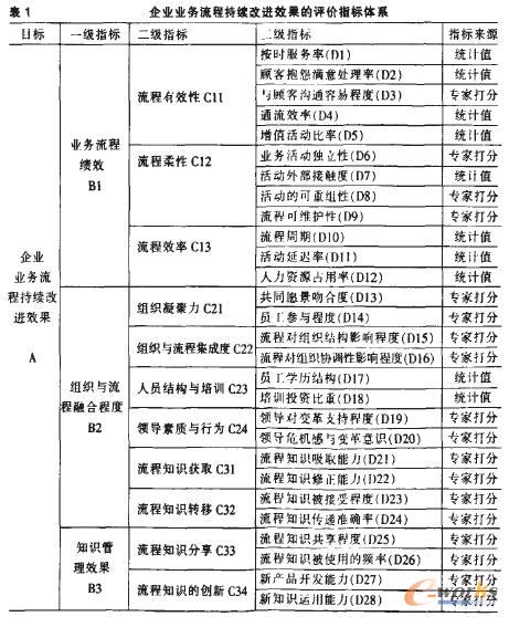 流程持續改進與業務流程再造(Business ProcessReengineing,BPR)相比,更關注流程的持續發展潛力。由于業務流程的持續改進離不開組織學習與知識管理的支持。它們是流程持續改進的主要工具與手段。所以,本文所建立的流程持續改進效果評價指標體系(見表1)不僅包含反映流程績效方面的指標。也包含反映企業具備的組織學習能力和知識管理能力方面的指標。