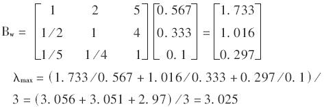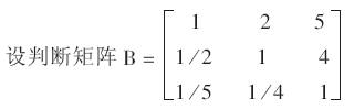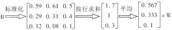 第四步,計算單個判斷矩陣的權重向量。權重向量的計算有兩種簡易算法:和法與根法。本文采用和法,但稍微改進一點,就是在計算權重向量前先將判斷矩陣的各個列向量標準化。下面用一個例子說明計算過程。