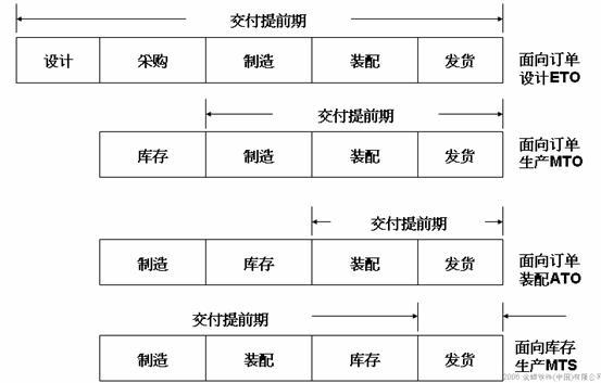 由于生產組織的特點,存在四種不同的制造策略:面向庫存生產、面向訂單裝配、面向訂單生產、面向訂單設計。其中面向庫存生產的交貨時間最短,但是也最容易產生庫存。
