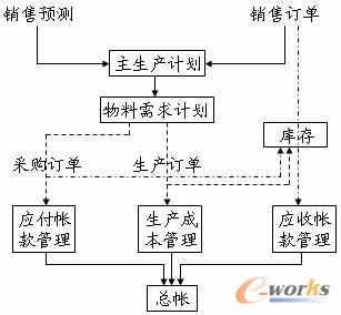 首先是銷售訂單和銷售預測進入系統,然后運行主生產計劃和物料需求計劃,這兩種計劃的結果就是生成采購計劃和生產計劃,采購計劃進入采購流程去執行,生產計劃進入生產流程去執行,生產完工入庫以后,銷售流程就可以繼續往下走,接著這三條流程都要進入財務處理,也就是往來帳管理和成本核算,最后都歸結到總帳。