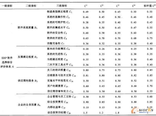 以某汽車配件企業(yè)為例對編號為R1、R2、R3、R4的ERP軟件進行選擇,建立如表1評價體系。根據前面給出的定性分析進行量化評價。