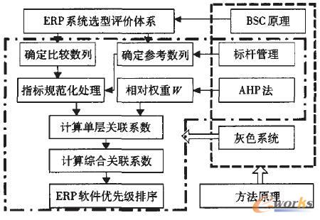 對于制造企業(yè)ERP選型,選型小組中既有制造專家,也有經營決策領導,不同業(yè)務領域的成員會持有各種不同觀點。解決這些差異的辦法是盡量將涉及的變量目標化,并且給每個變量特定的衡量指標。將定性的觀點定量化時,采用灰色系統(tǒng)的方法進行選型決策:根據評價體系確定比較數列,運用標桿管理確定參考數列及層次分析法(analytical hierarchy process,簡稱AHP)確定相對權重,最后確定綜合關聯(lián)度,根據關聯(lián)度對ERP軟件的優(yōu)先級進行排序。系統(tǒng)決策過程評價模型如圖1。