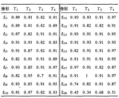 在R1、R2、R3、R4體系相應建立C1、C2、C3、C4比較數列(表1),并構成一個由4個評價單元、20個評價指標構成的評價系統(tǒng),組成的比較數列矩陣為