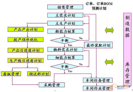 混合制造是指MRP(物料需求計劃)與JIT(準時化生產)相結合的混合制造模式。很多工廠既有小批量、多品種生產方式,又有批量流水生產方式。如發動機生產企業,總裝線上是批量流水生產,相關配套零件則是在鑄、鍛、焊、機加車間完成。這兩種生產方式特點不同,單獨用MRP或JIT的解決方案都會有問題,因此非常適合混合制造的解決方案,具體如下圖1所示。