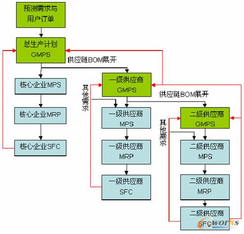 圖2中的協同供應鏈計劃將傳統ERP的生產計劃管理進行了擴展。在核心企業總生產計劃生成后立即進行一級供應商總生產計劃的編制,一級供應商總生產計劃生成后進行二級供應商的總生產計劃的生成。當然,這樣做必須建立在供應商是戰略伙伴關系的基礎上。