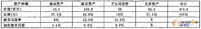 因為,企業(yè)的所有資金都會轉變?yōu)椴煌问降馁Y產形式,資產形式及其各自比例狀況(見表2)。以下四種形式:流動資產、固定資產、投資子公司、無形資產。本企業(yè)中除了無形資產外,每一種資產的要求回報率最化都比較容易。如流動資產和固定資產及子公司的“要求回報率”是各種資產的期望回報率。而動資產和固定資產的回報率與各自的期望周轉率有關,這里就不再贅述。子公司的要求回報率也可以通過期望盈利數(shù)額及期望投資數(shù)額的比例計算出。所以,表2中,“無形資產的要求回報率”設為“X”,“加權要求回報”設為“Y”。計算如下: