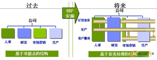 借助于ERP環境組織結構由單一向協同模式的轉變,同時,增強了消費者導向的運作協同,在ERP環境下更強調強調建立工作網絡;同時,借助于ERP對于企業管理者更容易的控制各個業務單元。組織結構轉變如圖1-1所示。