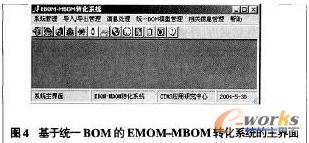 以41OOQB基本型柴油機(jī)產(chǎn)品為例開(kāi)發(fā)EBOM-MBOM轉(zhuǎn)化系統(tǒng)。轉(zhuǎn)化系統(tǒng)從PDM系統(tǒng)中提取4100QB基本型柴油機(jī)的EBOM信息并可以查看,當(dāng)ERP系統(tǒng)需要4100QB基本型的MBOM時(shí),需在轉(zhuǎn)化系統(tǒng)界面中經(jīng)過(guò)信息處理,主要為層次結(jié)構(gòu)變換、添加中間件、確認(rèn)裝配順序、添加部件裝配工藝信息、零件的加工工藝信息,生產(chǎn)管理信息等,再導(dǎo)入ERP系統(tǒng)。系統(tǒng)的主界面如下圖所示。