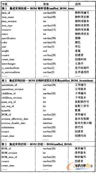 本實(shí)例中BOM集成重點(diǎn)需要考慮兩個(gè)部分:一是考慮EBOM信息如何在統(tǒng)一BOM中進(jìn)行組織和存儲(chǔ),二是要考慮MBOM信息如何從統(tǒng)一BOM中進(jìn)行獲取。集成實(shí)例的統(tǒng)一BOM實(shí)際是EBOM信息和MBOM信息在統(tǒng)一BUM中的合理組織和描述。由于EBOM和MBOM的差異,在EBOM向MBOM轉(zhuǎn)化過(guò)程中必然要涉及信息的調(diào)整和變化,這種信息的變化是由用戶通過(guò)EBOM-MBOM轉(zhuǎn)化系統(tǒng)對(duì)信息進(jìn)行處理所得到。集成實(shí)例的統(tǒng)一BOM數(shù)據(jù)庫(kù)有下面各表(由于篇幅所限,僅列出各表中主要字段):
