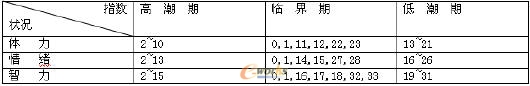 還有一種簡易的判別人體生理節(jié)律的方法--將上述"總天數(shù)"分別用23、28、33整除所得余數(shù)即為人體生理節(jié)律的簡易狀況指數(shù),對照下表就可確定人體的體力、情緒和智力的狀況,但此法僅限于定性判斷。