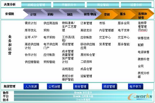 第三部分為分析系統:基于企業的業務和管理系統,企業必須基于目標、事實、例外進行分析和比較,ORACLE的商業智能工具為企業多角度分析和預測提供支持。