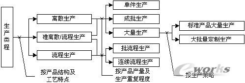準流程/準離散生產通常針對特定企業的某些生產環節而言,在該生產環節,很難簡單歸為流程型或離散型,而是同時兼具有二者的某些特點。這里把這些環節的生產類型稱為準流程/準離散型。