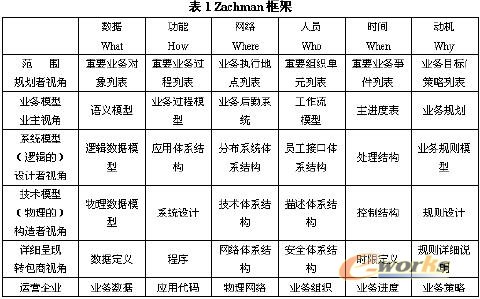 Zachman框架是由John Zachman在1987年提出以來,Zachman框架(見表1)是一個由行和列組成的二維結(jié)構(gòu),行基于模型使用/描述者的視角對企業(yè)進(jìn)行描述,最頂層的行表示企業(yè)的最一般的描述,層次越低的行對企業(yè)的描述越具體;列基于人們理解問題時經(jīng)常涉及的問題的角度定義了各視角的抽象域。Zachman框架具有容易理解、描述全面、獨(dú)立于各種工具與方法學(xué)等優(yōu)點(diǎn)而得到了廣泛的認(rèn)可,很多建模框架都被認(rèn)為是Zachman框架的派生[2]。