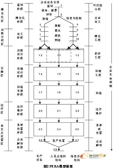 PERA(見圖2)是由美國Purdue大學(xué)應(yīng)用工業(yè)控制實驗室于1990年12月開始開發(fā)的,它試圖為基于CIM的企業(yè)提供一套企業(yè)建模的框架及方法學(xué)。它支持企業(yè)設(shè)計的全生命周期建模,并在各個階段中提供對人員及組織因素的處理方法,提供了各階段的信息模型,給出了對各類接口進(jìn)行分析的方法指導(dǎo)。但是,到目前為止,PERA描述復(fù)雜系統(tǒng)的能力有待進(jìn)一步研究,另外,還沒有標(biāo)準(zhǔn)軟件能夠支持PERA結(jié)構(gòu)的建模和分析[2]。
