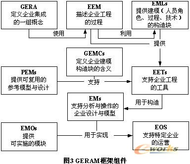 GERAM[6]是IFAC/IFIP企業(yè)集成框架任務(wù)組在對現(xiàn)有企業(yè)集成框架(CIMOSA、GRAI/GIM、PERA)進(jìn)行評價的基礎(chǔ)上開發(fā)的通用化的企業(yè)參考框架與方法學(xué)。它提供了一組用于企業(yè)工程及信息集成的通用概念,定義了可用于特定建模工具及方法必須滿足的一組標(biāo)準(zhǔn)。GERAM包括一組緊密聯(lián)系的組件,見圖3,包括:通用企業(yè)參考框架組件(GERA)、企業(yè)工程方法學(xué)組件(EEMs)、企業(yè)建模語言組件(EMLs)、通用企業(yè)建模概念組件(GEMCs)、企業(yè)參考模型組件(PEMs)、企業(yè)工程工具組件(EETs)、特定企業(yè)模型組件(EMs)、企業(yè)模塊組件(EMOs)、特定企業(yè)運(yùn)行系統(tǒng)組件(EOSs)。GERA建模框架見圖4。
