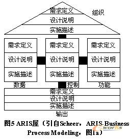 ARIS是德國Scheer教授提出的一種面向過程的、集成化的信息系統(tǒng)模型框架。ARIS結(jié)構(gòu)是從過程鏈模型抽取、發(fā)展而來的。在ARIS概念中,“過程”是由起始事件和終止事件定義的。過程的對象可以是物質(zhì)的轉(zhuǎn)變過程,也可以是信息的轉(zhuǎn)變過程。在ARIS結(jié)構(gòu)(見圖5)中,控制視圖是ARIS區(qū)別于其它建模框架的重要特征,被用來記錄和維護(hù)數(shù)據(jù)視圖、組織視圖和功能視圖之間的關(guān)系,而組織、數(shù)據(jù)、功能視圖的發(fā)展過程是相對獨(dú)立的;面向系統(tǒng)的生命周期,ARIS定義了需求定義、設(shè)計說明和實施描述三個建模層次。為減少結(jié)構(gòu)的復(fù)雜性以及冗余,ARIS還對過程鏈模型做了簡化,更加關(guān)注信息的轉(zhuǎn)變,舍棄與信息過程無關(guān)的因素,利用分階段的或者程序化的模型來減少描述視圖相互之間的關(guān)系。例如:真實的物質(zhì)轉(zhuǎn)變過程、物質(zhì)轉(zhuǎn)變過程中人的行為、所需的物料及設(shè)備,都以“環(huán)境條件”的形式出現(xiàn)在信息描述中,從而,從信息過程的角度看,生產(chǎn)過程不再是物料、人力和生產(chǎn)設(shè)備的使用,而是生產(chǎn)過程中數(shù)據(jù)的交換,這個信息過程的操作還涉及:過程計劃、能力規(guī)劃、生產(chǎn)進(jìn)度控制等。另外,ARIS有一套標(biāo)準(zhǔn)的、可相互集成的軟件工具集支持ARIS建模及仿真分析,并可與SAP R/3等ERP商業(yè)套件集成在一起,提供BPR、ERP系統(tǒng)實施、企業(yè)流程監(jiān)控及持續(xù)改進(jìn)等一體化的解決方案。從而,ARIS成為目前世界上極具影響力的建模框架。