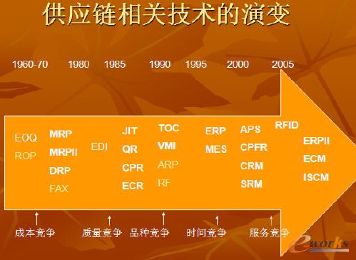 從歷史上來講,供應鏈一些相關技術在不斷演變,隨著我們企業競爭焦點不斷的演變,技術也發生一些改變。早期60、70年代我們叫基于成本的競爭,這個時候更多從庫存降低成本角度,所以當時庫存EOQ、ROP經典庫存管理,后來演變成DRP,制造資源計劃等等,這些都是在70、80年代就發展出來。后來就是EDI技術,到了80年代叫質量競爭的時代,日本的企業風靡全球有一個GIT,就是“四化”生產,現在叫精益生產或者精細生產。還有供應鏈QR快速反應,CPR就是快速補給系統,ECR有效客戶響應,也是在那個時候發展起來的。